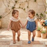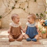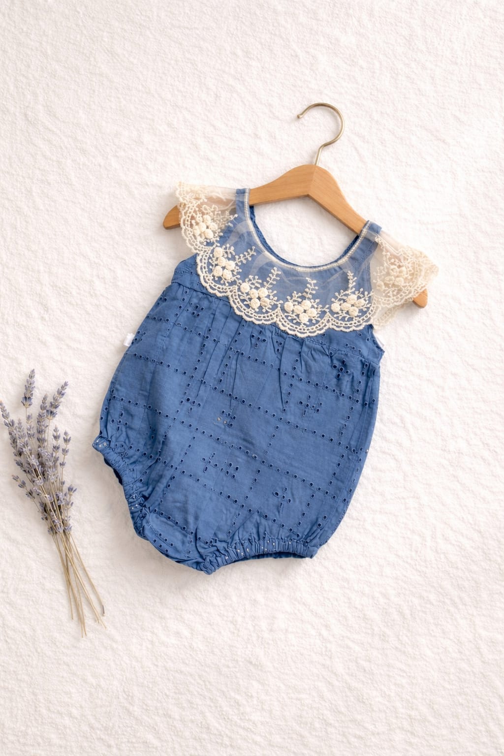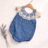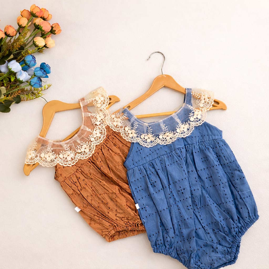 A delicate eyelet romper elevated with an intricate lace collar that adds timeless grace to a playful silhouette. Available in warm earthy brown and serene dusty blue, each piece blends vintage romance with everyday comfort. The breathable fabric keeps it light, while gentle gathers create softness and movement. Designed for effortless charm, it transitions beautifully from quiet mornings to special outings. Snap closures allow easy changes without disrupting comfort.