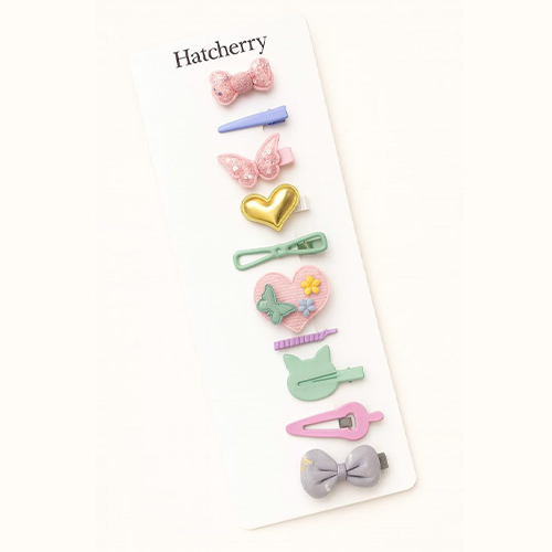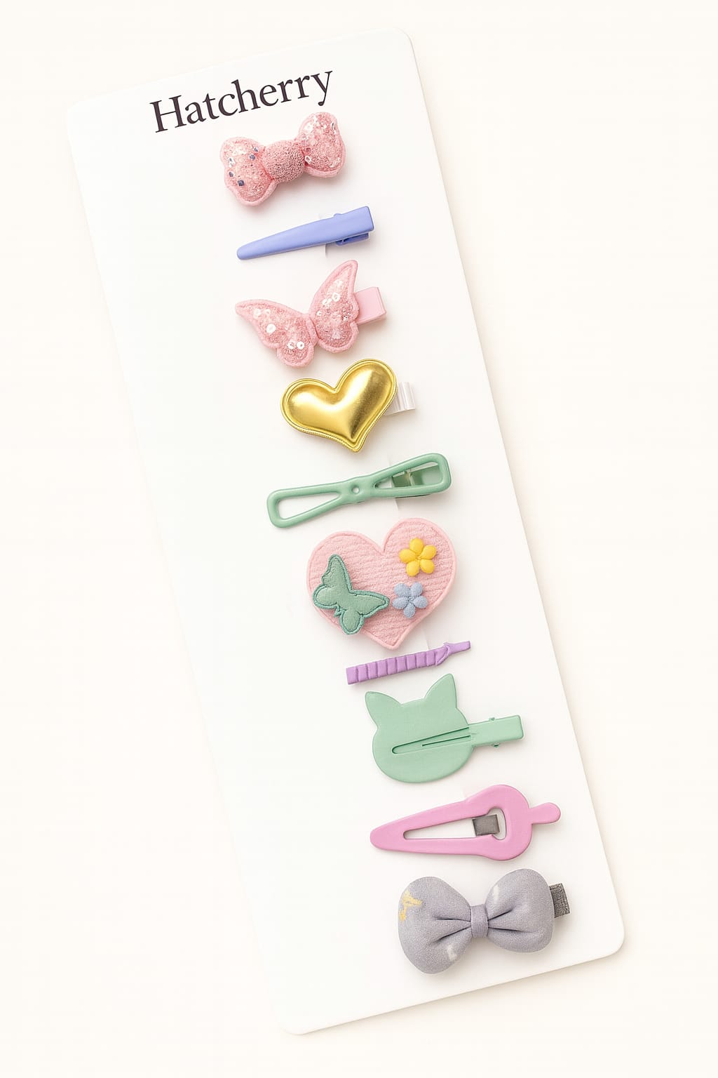 Sweeten your child’s look with the Blush Charm Hair Clip Set from Hatcherry — a 10-piece collection of pastel pretties and playful shapes. Featuring sequined bows, gold hearts, butterflies, and adorable character clips, this set is designed to add magic and charm to every hairstyle.