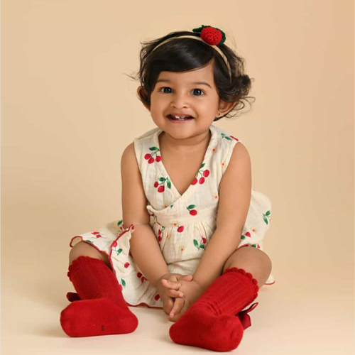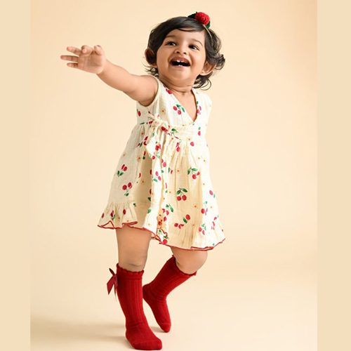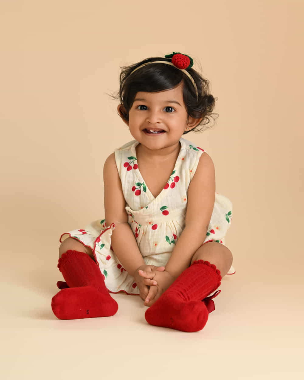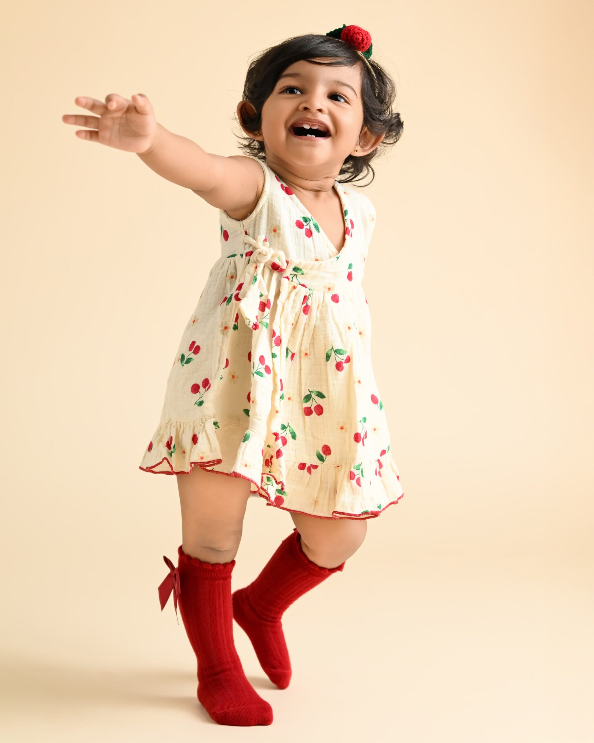 A burst of fruity fun! This sleeveless cherry-printed dress features soft cotton fabric, playful frills, and a comfy wrap-style fit. Perfect for sunny days, birthdays, or twirling around with joy.🍒