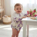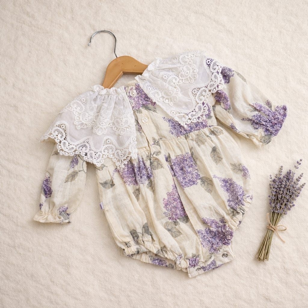 A timeless floral romper crafted in a soft ivory base with delicate lavender blooms and an exquisite lace collar that frames the neckline with vintage elegance. The gentle gathers create a relaxed silhouette, while full sleeves add warmth and charm. Designed for comfort and heirloom appeal, this piece balances romance and practicality for special outings or serene everyday moments. Snap closures ensure easy changes without fuss.