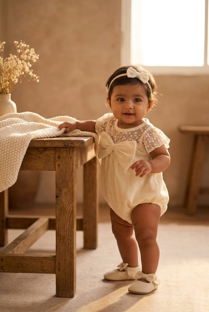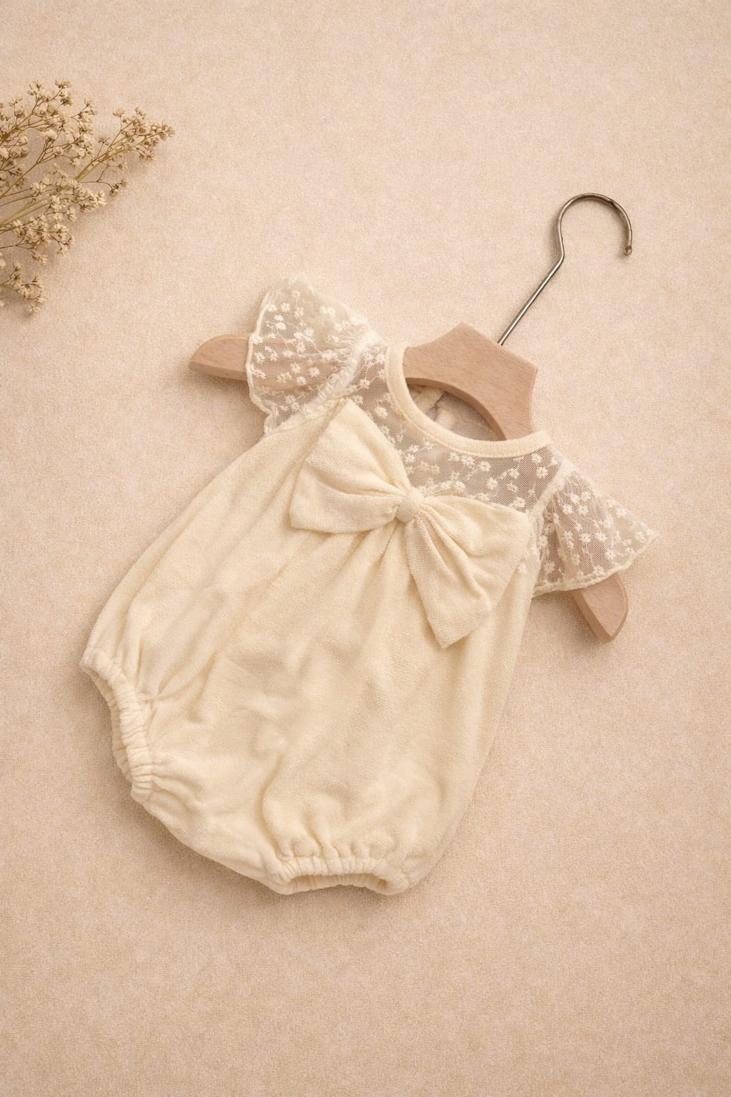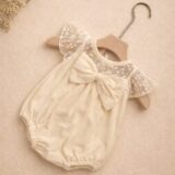 A soft ivory romper designed with delicate lace sleeves and a statement bow that captures pure vintage elegance. The textured fabric adds depth, while the airy lace yoke creates a graceful silhouette. Gentle gathers offer comfort and freedom of movement, making it perfect for celebrations, portraits, or cherished everyday moments. Its timeless tone pairs beautifully with neutral or pastel accessories, creating a refined yet playful look. Snap closures ensure easy dressing without discomfort.