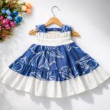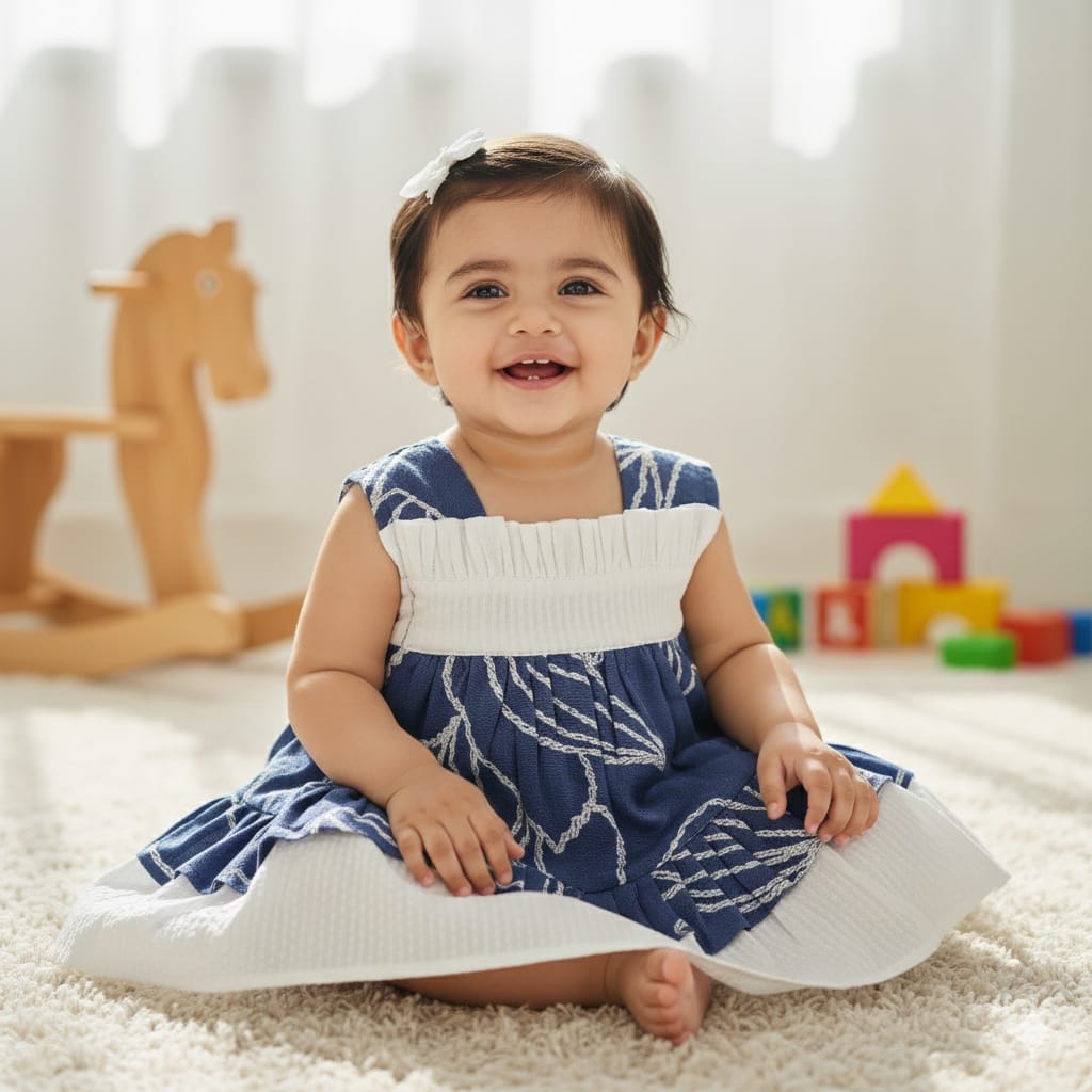 This elegant baby dress features a soothing indigo blue print beautifully layered with soft ivory ruffles, creating a graceful and airy silhouette. Made from breathable, lightweight cotton, it ensures comfort throughout the day while allowing free movement. The elasticated neckline offers easy dressing and a gentle fit, making it ideal for everyday wear, outings, or special moments. The tiered design adds charm and volume, giving the outfit a boutique-inspired finish that feels both playful and refined.
